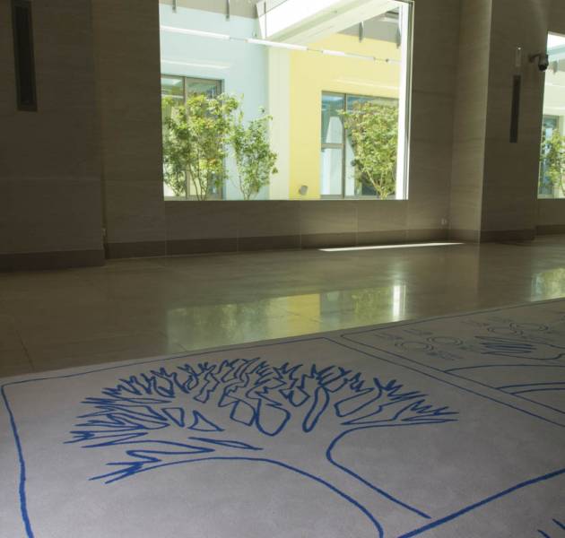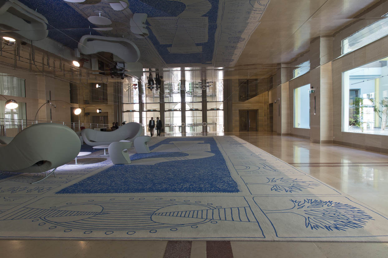 - Coloris choisi pour faire le lien entre la pierre du sol et le bleu aérien de l’auditorium, lieux de concentration et de réflexion.